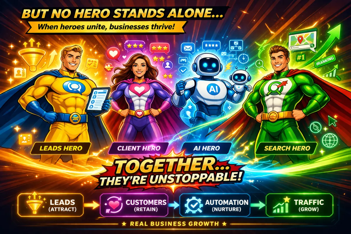 The Biz Hero system is built on the idea that no single strategy works in isolation. By combining lead generation, customer retention, automation, and SEO into one connected ecosystem, your business benefits from a complete marketing solution. Each component supports the others, creating a seamless flow from attracting traffic to converting and retaining customers. This integrated approach ensures maximum efficiency, better results, and long-term business growth.